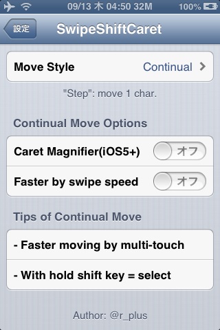 しかし、iOSも5.1となり、私も痺れを切らしてしまったので、「SwipeShiftCaret」を紹介します。