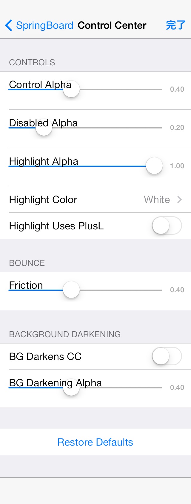 スライダーがオレンジに着色されていますが、これもSpringBoard Settingsで設定できる項目の1つです。