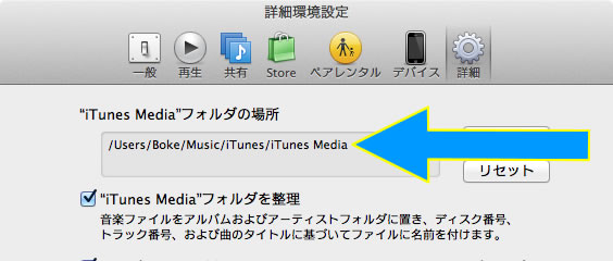 詳細タブに、iTunes Mediaフォルダの場所を示すパスが記述されています。