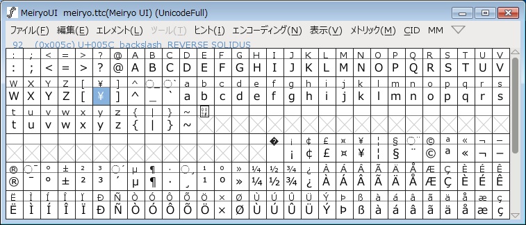 では、FontForgeで、meiryo.ttcを開きましょう。