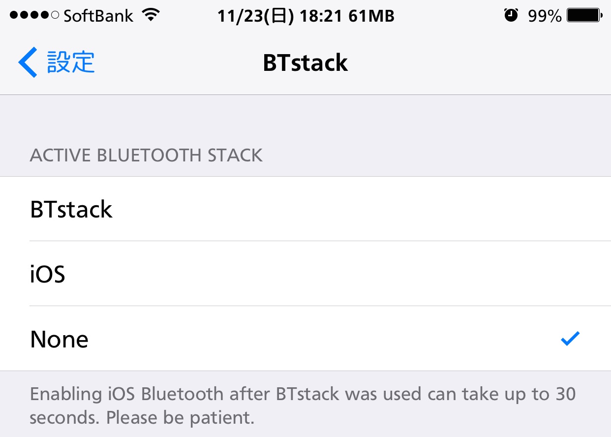 「None」になっていましたので、「BTstack」をタップし、選択します。
