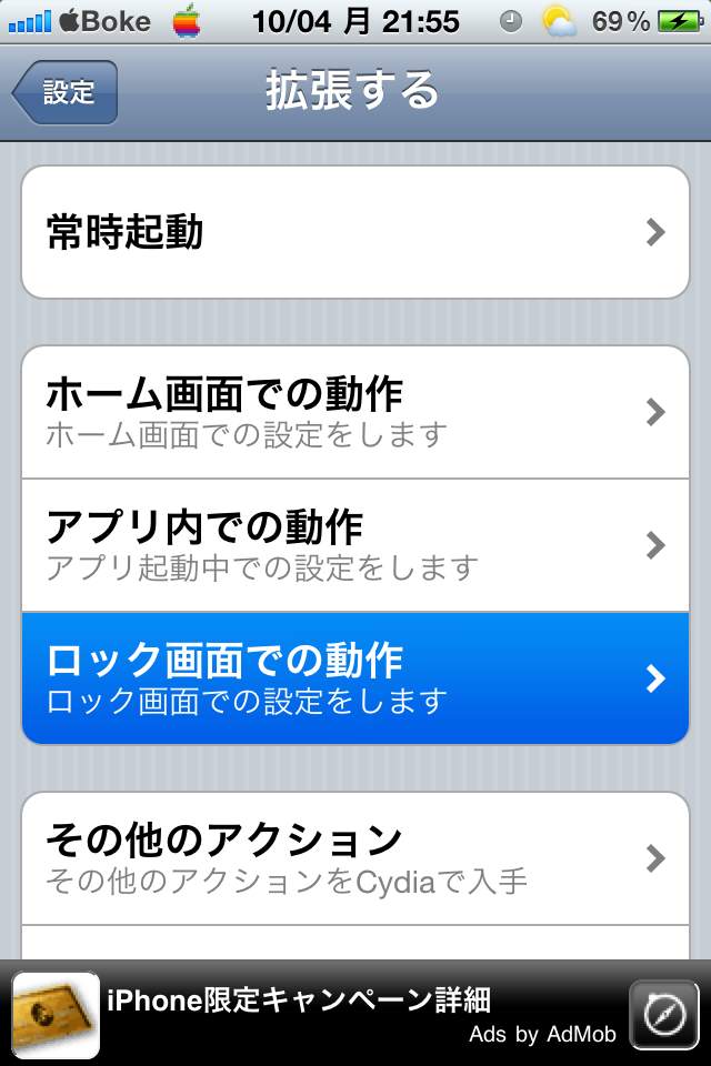 「ロック画面での動作」ー「ダブルタップ」で出てくる動作群ですので、他の組み合わせ方によってはメニューが増えます。