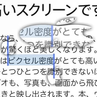 メールやメモばかりでなく、Safariなどでも、文字をコピーする時などによく目にするのがドラッグドットですが、このドラッグドットを移動させて、コピー範囲を調整する時、拡大画像を表示してくれるのがマグニファイヤーです。